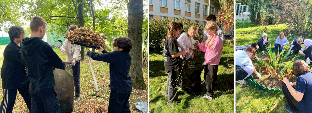 Школьники из корпуса на #Корнейчука52а уже несколько раз вместе с учителями выходили на улицу и убирали опавшую листву, приводили в порядок клумбы. Вместе они не только поддерживают чистоту и порядок на своём школьном участке, но и учатся работать в команде, развивать ответственность за общее дело, любить свою школу и заботиться о природе.
