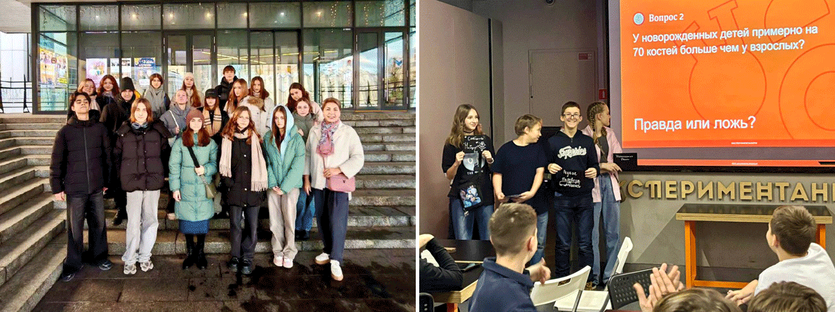 Семиклассники отправились музей для умных и любознательных детей и взрослых - "Экспериментаниум". Сначала ребята побывали на экскурсии, во время которой с помощью интерактивных экспонатов узнали о законах механики, электричества, магнетизма и акустик, увидели оптические иллюзии, головоломки и многое другое. Потом школьники сыграли в квиз, они разделились на команды и за отведённое время отвечали на вопросы из разных областей науки: математики, физики, химии, экологии и других. Семиклассникам пришлось показать не только свои знания, но и логику, эрудицию и наблюдательность.