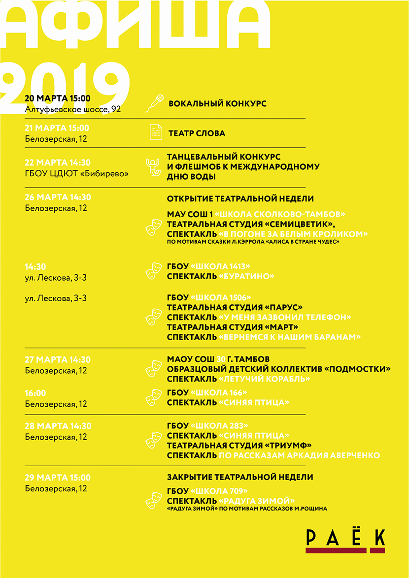 Рады представить вам афишу межрайонного фестиваля "Раёк-2019". Фестиваль начинается сегодня 20 марта в 15.00, и в это же время 29 марта состоится торжественная церемония награждения. Нелегко придется жюри фестиваля: традиционно в нем участвуют одни из самых талантливых ребят нашей школы, нашего района, нашего города. А в этом году к нам присоединяются театральные коллективы из Тамбова.