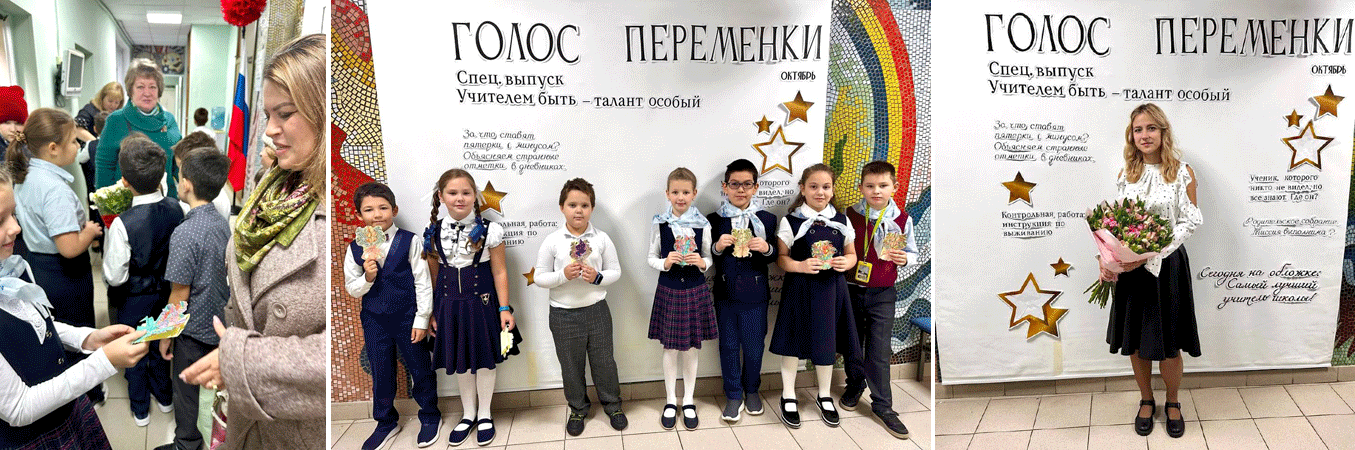 В корпусе на #Корнейчука50а ученики начальной школы придумали необычную фотозону для педагогов, которых приглашали к ней на переменках для поздравлений. Ребята дарили открытки, сделанные своими руками, читали стихи и говорили учителям много добрых слов.