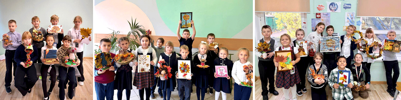 Ученики начальных классов принесли в школу свои поделки из природных материалов. Дети использовали для создания работ разноцветные листья, каштаны, жёлуди, шишки, веточки и даже сухие ягоды. Ещё ребята экспериментировали с пластилином, бумагой и картоном, нитками, красками - всем, что могло сделать поделки оригинальными и запоминающимися.