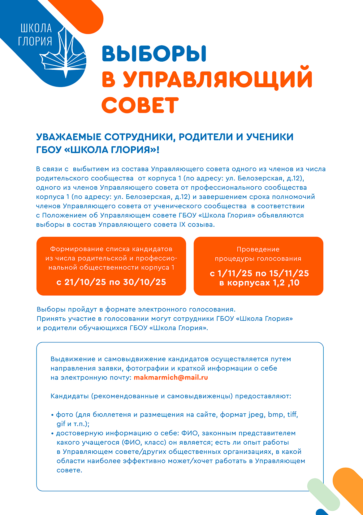 Выборы в Управляющий совет ГБОУ "Школа Глория" 10.11.2025