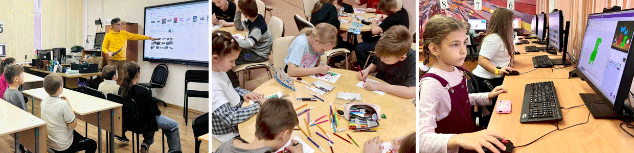Не менее ярко и насыщенно прошёл этот день в школьном лагере на #Корнейчука52а. Сначала ребята рисовали изонитью, создавая свои картины, вышивая на картоне. Потом они осваивали Скретч, язык программирования для детей, с помощью которого анимировали фигурки компьютерных персонажей. Ещё у ребят было творческое занятие "Краски осени", где они из разноцветных салфеток создавали красочные объемные осенние листья.
