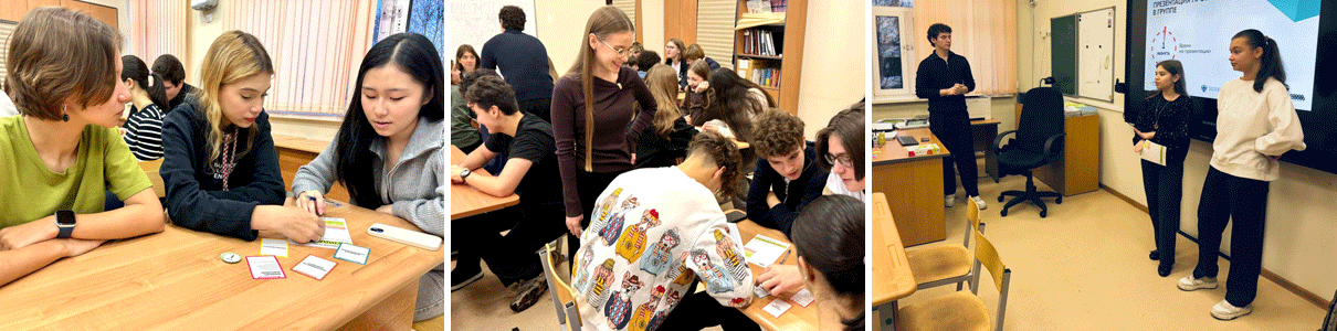Десятиклассникам нужно было создать и презентовать социально-полезный предпринимательский проект. Для этого команды соединяли случайно выбранные элементы: название компании, целевую аудиторию, продукт или услугу и инструмент продаж. Например, одна команда придумала умные зонты, в которые вмонтирована колонка, поэтому можно слушать музыку, даже в дождь при разряженных наушниках. Другая разработала экологическую упаковку для работников офиса, которые много времени проводят на работе и заказывают туда еду. Такой формат развивает предпринимательское мышление, креативность и навыки публичных выступлений, позволяет школьникам в интерактивной и увлекательной форме познакомиться с основами создания бизнеса.