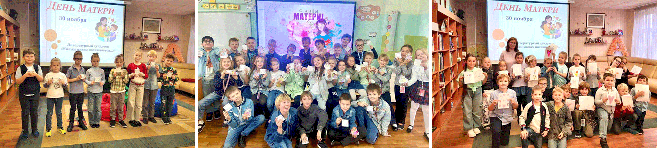 В пятницу участники проекта "Орлята России" раздали эти маленькие открытки-сувениры по классам, присоединившись к трогательной акции "Движения Первых", которая проводится уже третий год подряд. В читальном зале библиотеки прошёл литературный час "Милым мамам посвящается…", на котором юные читатели познакомились с историей возникновения праздника. Ребята рассказывали стихи о маме, с удовольствием отвечали на вопросы литературной викторины "Сказочные мамы", дружно играли в игру "Угадай сказку", вспоминали пословицы про маму.